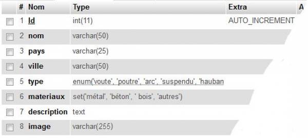 Nous allons créer une table qui contiendra les informations utiles sur les ponts :