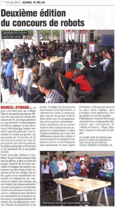 Le mercredi 19 juin à 10 heures, les élèves de troisième se sont retrouvés sous le préau du collège, pour cause de mauvais temps, afin de déterminer l'équipe championne 2013 du concours de robotique.