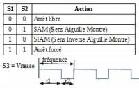 Un circuit pont en H est utilisé pour piloter un moteur dans les 2 sens de rotation et en permettant une variation de vitesse dans danger pour la carte de commande. Il obéit à la table de vérité ci-contre.