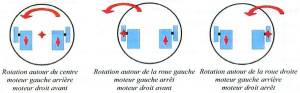 Les 2 moteurs du robot commandés d'après la table de vérité imposent un axe de rotation sur la roue arrêté (si un seul moteur est commandé) ou à mis chemin entre les 2 (s'ils n'ont pas le même sens de rotation).