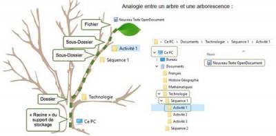 On parle d'arborescence car en partant du support de stockage (le tronc), les dossiers se déploient comme les branches d'un arbre et contiennent des fichiers (les feuilles).