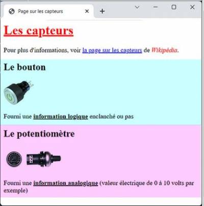 <!doctype html> <html lang="fr"> <head> <title>Page sur les capteurs</title> <meta content='text/html; charset=UTF-8' http-equiv='content-type' /> <link rel='stylesheet' type='text/css' href='./style.css' /> <body> <h1>Les capteurs</h1> <p>Pour plus d'informations, voir <a href="https://fr.wikipedia.org/wiki/Capteur">la page sur les capteurs</a> de <cite>Wikipédia</cite>.</p> <div class="mf1"> <h2>Le bouton</h2> <img src="./bp.jpg" /> <p>Fourni une <span class="mf2">information logique</span> enclanché ou pas</p> </div> <div class="mf3"> <h2>Le potentiomètre</h2> <img src="./pot.jpg" /> <p>Fourni une <span class="mf2">information analogique</span> (valeur électrique de 0 à 10 volts par exemple)</p> </div> </body> </html>