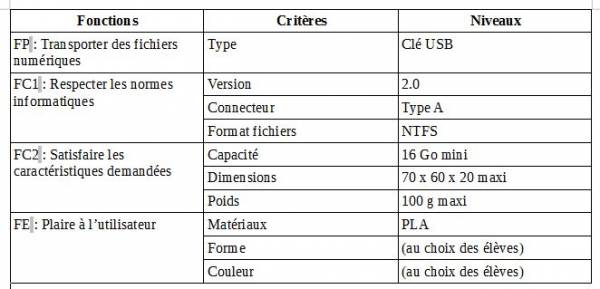 Définir la cahier des charges d'un objet servant à transporter des fichiers numériques entre la maison et le collège.