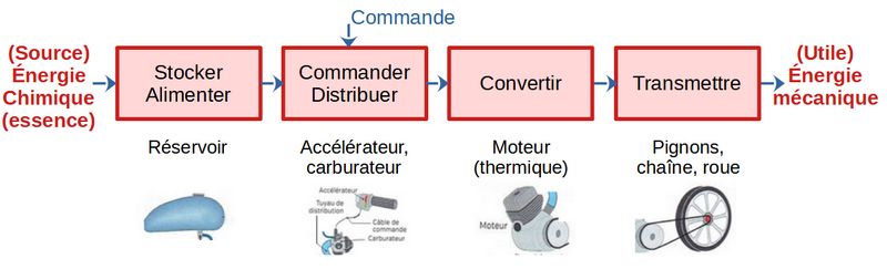 La chaîne d'énergie et la représentation graphique des fonctions techniques à mettre en œuvre pour décrire le flux d'énergie utilisé dans l'objet technique.