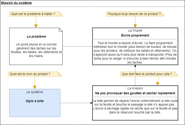 Afin de définir la la mission à remplir par le projet (d'un bien ou d'un service) il est nécessaire de bien formuler la réponse à plusieurs questions. Pour cela, on utilise un diagramme SysML. (Le SysML est un langage graphique qui
