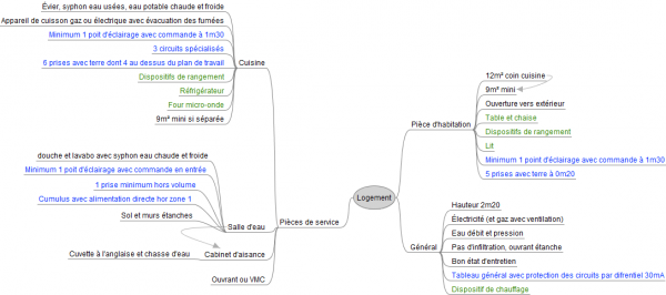 J'identifie les documents de référence et réalise des enquêtes sur les attentes des clients avant de réaliser une carte mentale à partir du Décret 87-149 du 6 mars 1987 « fixant les conditions minimales de confort et d’habitabilité auxquelles doivent répondre les locaux mis en location » (noir), de la norme électrique NF-C-15-100 (bleu) et des attentes des étudiants (vert).