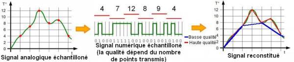 Chaque octet du signal numérique contient la valeur d'un point du signal analogique (voir le code binaire). On dit que l'on échantillonne (découpe en points) le signal analogique. Plus on transmet d'échantillon par seconde, meilleure est la qualité. En reliant les points on retrouve le signal.