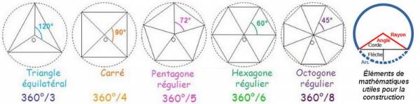 On remarque, sur les dessins ci dessus, que les cotés des figures correspondent aux cordes d'un cercle et qu'au moins un coté est horizontal. On détermine donc le point de départ du tracé (dans un repère, l’écran, l'abscisse est fonction de la corde et l'ordonnée du cosinus de l'angle par rapport à l'axe des ordonnées).
