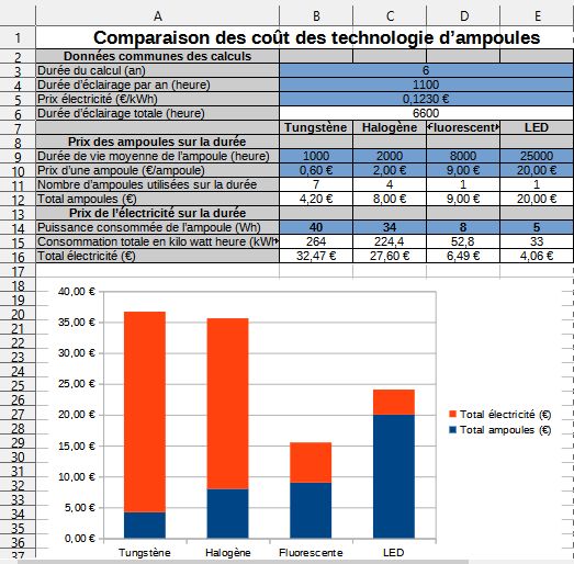 Dans cette activité, nous allons calculer le coût réel des 4 ampoules vus précédemment sur une période variable et les comparer grâce à un graphique pour visualiser les économies réalisées.